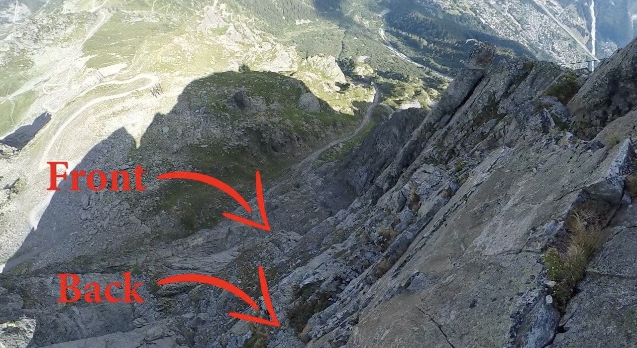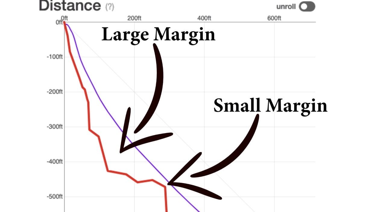 These checkpoints are usually ledges and outcroppings (coincidentally, the places you might impact). They are measured in feet or meters as -Down/out. For example, if I jump here I will need to clear that ledge. Once I pass that ledge, I am safe. The furthest part of that ledge measures -362/69 feet. In this case the performance mandatory is a ledge that extends to 69 feet out from the exit at 362 ft below the exit. Simply, you will need to be further than 70 feet away from the exit by the time you have fallen 360 feet, if you want to clear that particular ledge.