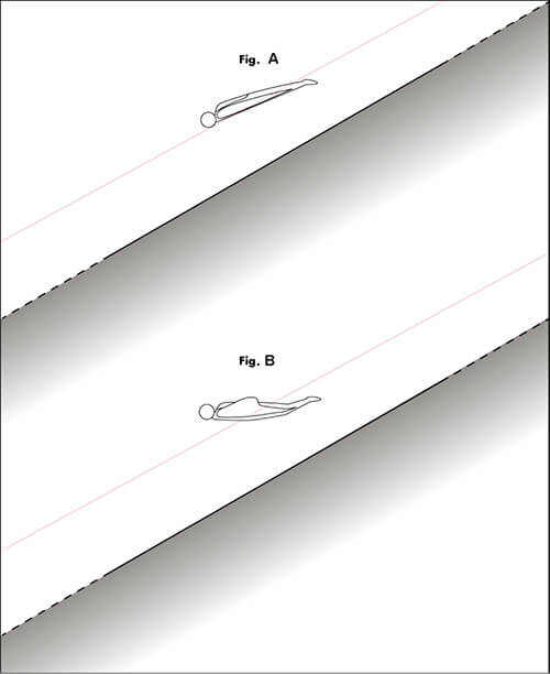 Technically, Angle of Attack is not related to the horizon, it does not define the direction you are flying, and it cannot be described as “steep” or “flat”. But don’t worry too much about that, all we need to know for our wingsuit application is illustrated in this drawing. The first guy (fig A) is doing it right. The second guy (fig B) is… “doing it”. (“yeeha burbly scott, yer doin it!”).
