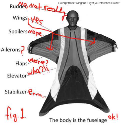 Figure 1a, 1b. That’s my red pen, over illustrations in a wingsuit training manual that can still be found on dropzone.com! Parts of said manual seem to have been written by a con-man.