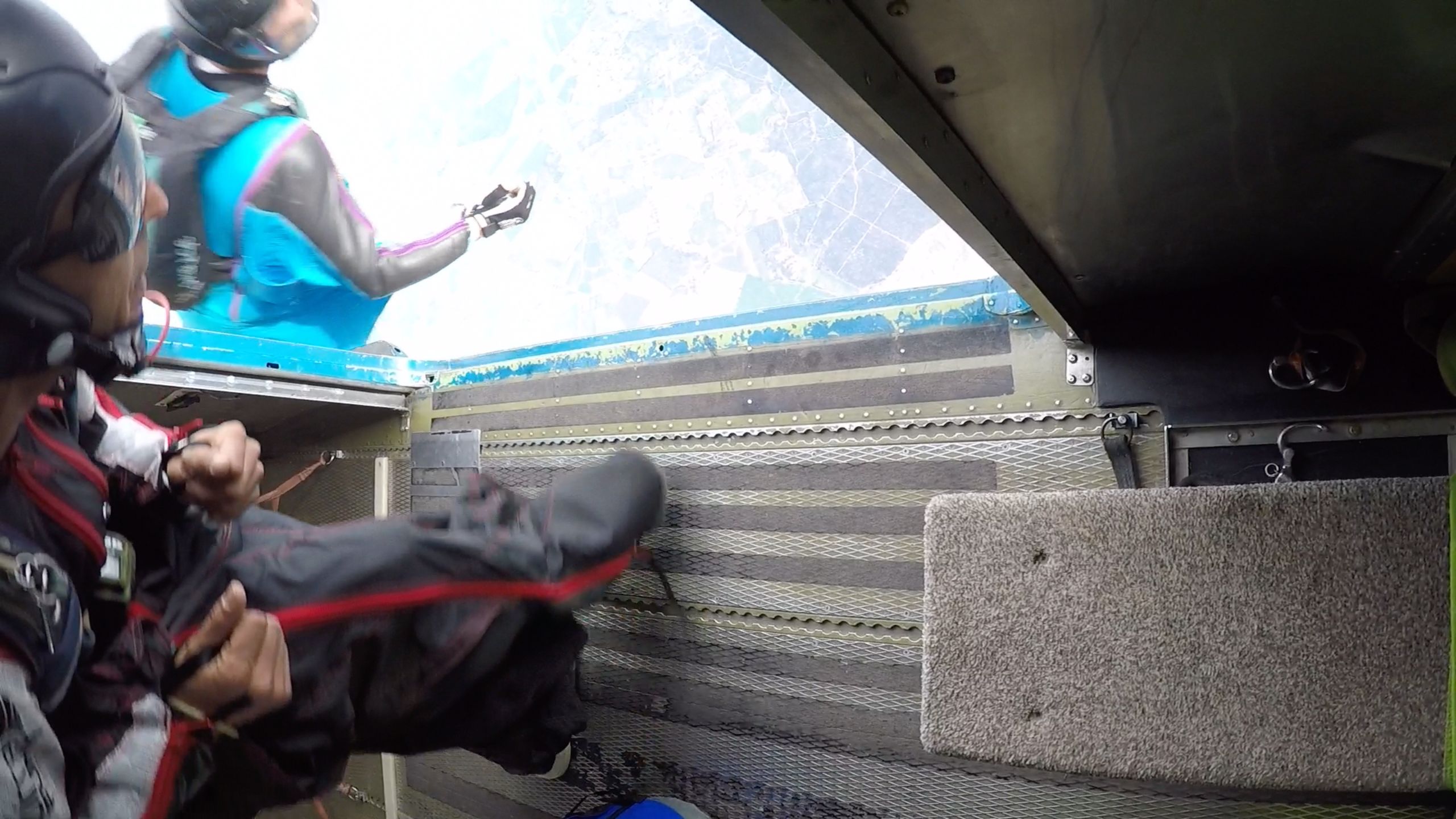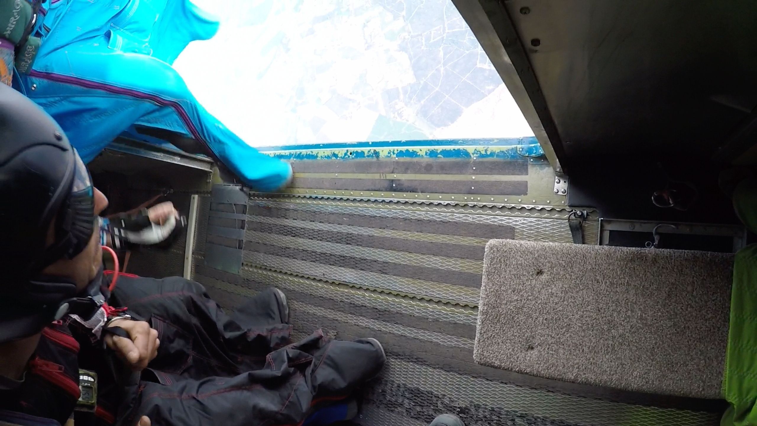 Don’t! A good wingsuit exit never ever involves jumping up. There is never any reason to jump up out of the door. Dive out and down, if anything. If you are having a hard time with this, imagine what it feels like to put your hand on a low fence and swing your legs over it. From a low position, put your right hand (if it’s a left side door) on the floor in the door, and swing your legs out as you exit with the top of your head (and spine axis) pointed into the relative wind. This should keep your torso more level to the relative wind, and prevent any upward exit tendencies.