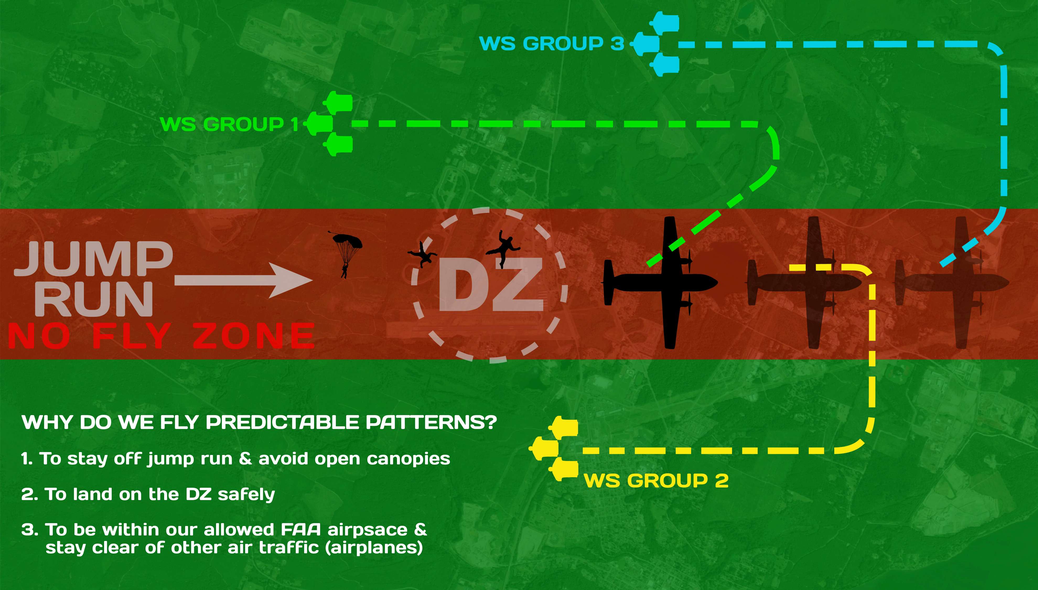 Whether or not an extra pass becomes necessary or recommended depends on the airspace that is available at your DZ, and the number of wingsuit and tracking groups on the plane. If your DZ has two established lanes of flight, and hopefully two established parachute opening “zones” (one opening zone for each lane and group), then there should only be two groups per pass. There are very few DZs on Earth where more than three groups can exit and fly safely back to the DZ.